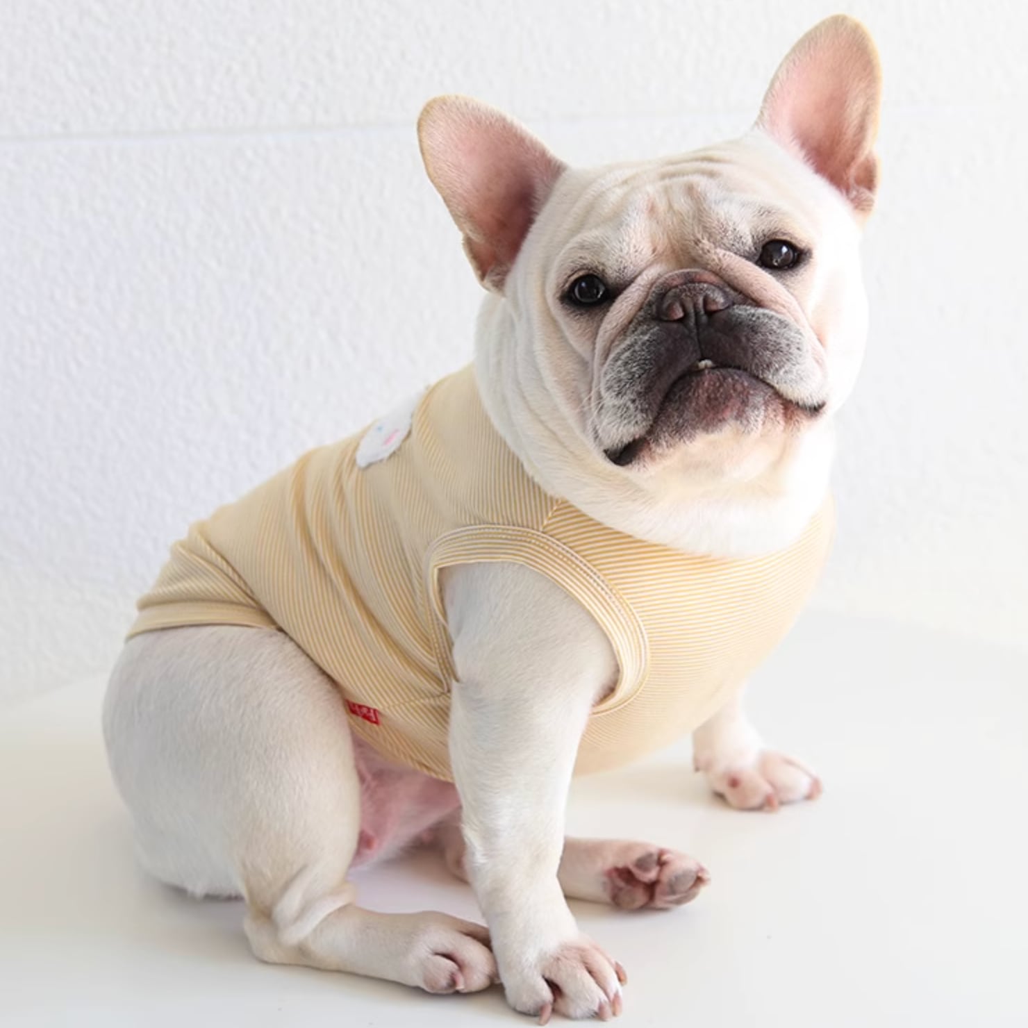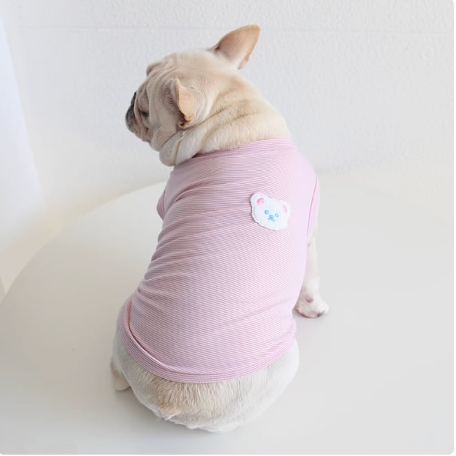 クマのワッペンが可愛い、シンプルなボーダー柄のペットウェア。コットン素材で、快適な着心地。 -size- XS:着丈29cm、胸囲48cm S:着丈32cm、胸囲52cm M:着丈34cm、胸囲56cm L:着丈36cm、胸囲60cm XL:着丈39cm、胸囲64cm XXL:着丈42cm、胸囲70cm -color- pink beige