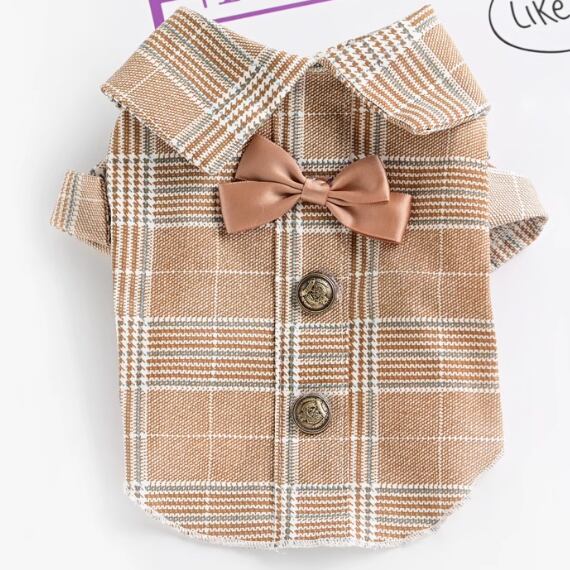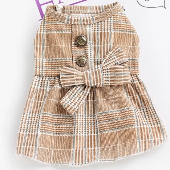 おしゃれなチェック柄のペット用セットアップ。ワンピースタイプとシャツタイプの2デザインで、ペアコーデも楽しめます。 -size- XS:着丈19cm、胸囲28cm S:着丈24cm、胸囲34cm M:着丈28cm、胸囲38cm L:着丈32cm、胸囲42cm XL:着丈36cm、胸囲48cm -color- khaki (dress) khaki (suit)